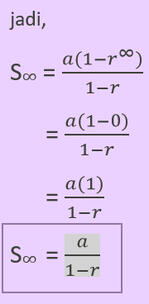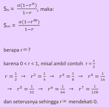 deret geometri tak hingga adalah jumlah seluruh suku pada barisan geometri, dari suku pertama sampai suku terakhir.barisan geometri yang dapat dijumlahkan seluruh suku-sukunya sampai habis hanya barisan geometri dengan nilai rasio (r) tertentu, yaitu 0 < r < 1untuk mencari jumlah seluruh suku, dapat dipakai persamaan deret geometri.